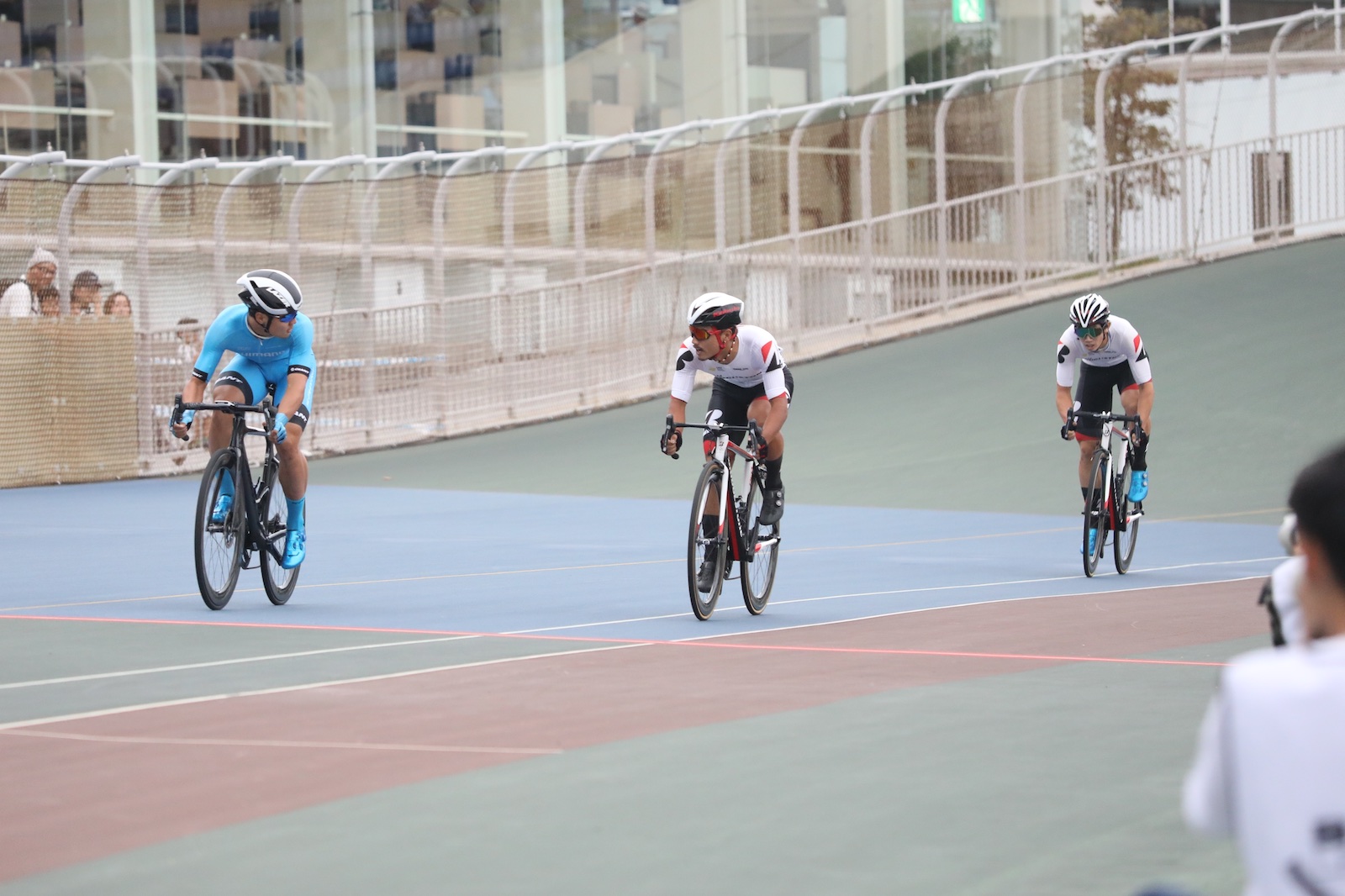 一回戦は石橋以外はスプリンターというチーム。その石橋が一周目からアタック、ブラーゼン選手と2名で先行。その速度は速く後続の6名は離れていき、最初のポイント周回では石橋と相手選手との一騎打ち。