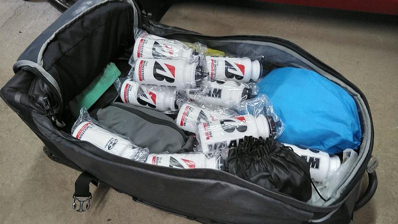 レース時は、自転車についているドリンクボトルに《ヴァーム スマートフィットウォーター》を入れ、背中のポケットには《ピットイン エナジージェル》やジャムパンなどを携帯しスタートします。レース途中での栄養補給も行うため、フィードゾーンではサコッシュにドリンクボトルやジャムパンなどのカロリーの高い固形物とピットインをセット入れて渡すことも。
